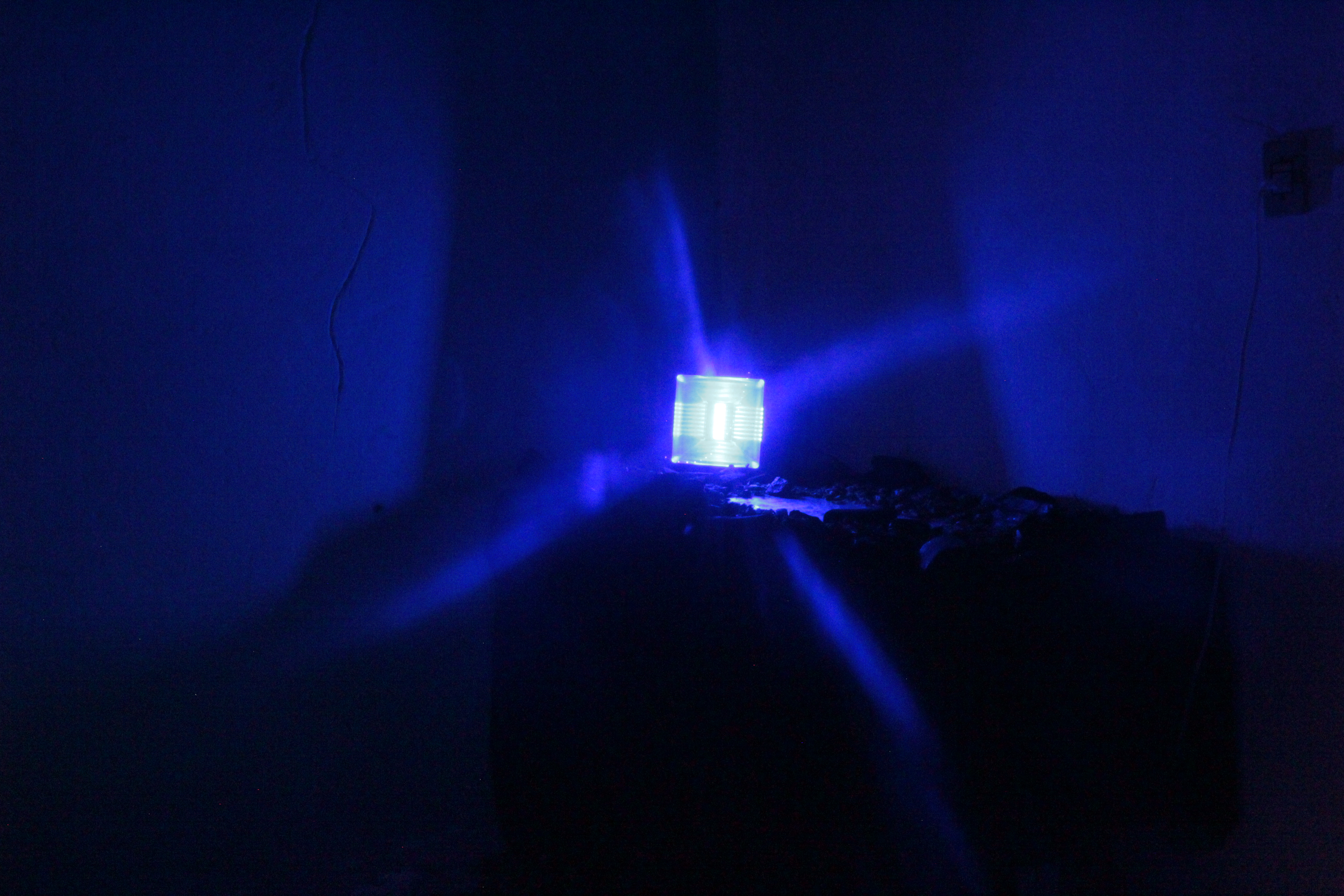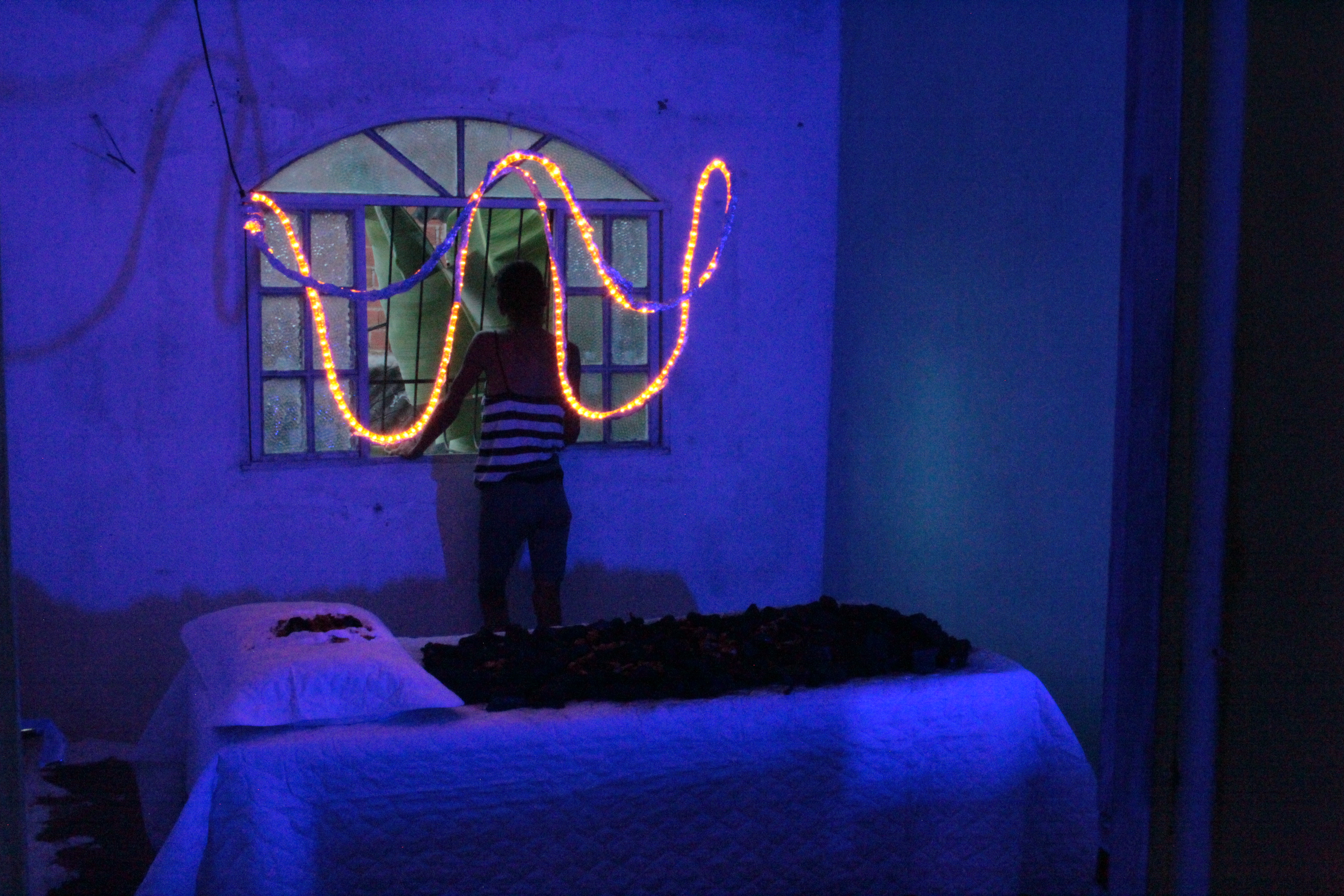 materiais: 10kg de sal, 40 kg de carvão, pétalas de 100 rosas brancas, luz azul 100W, luz laranja 100 w